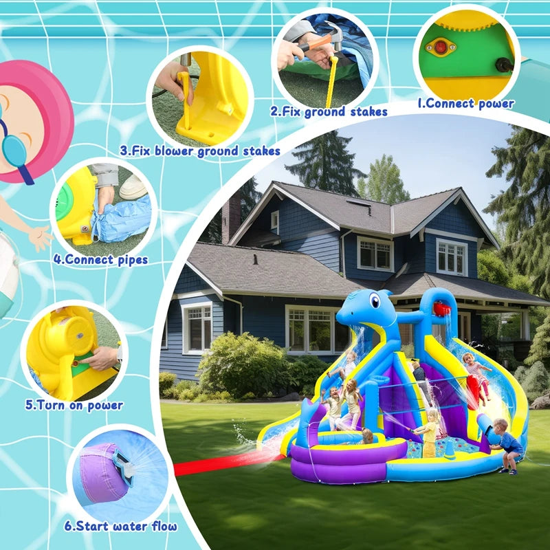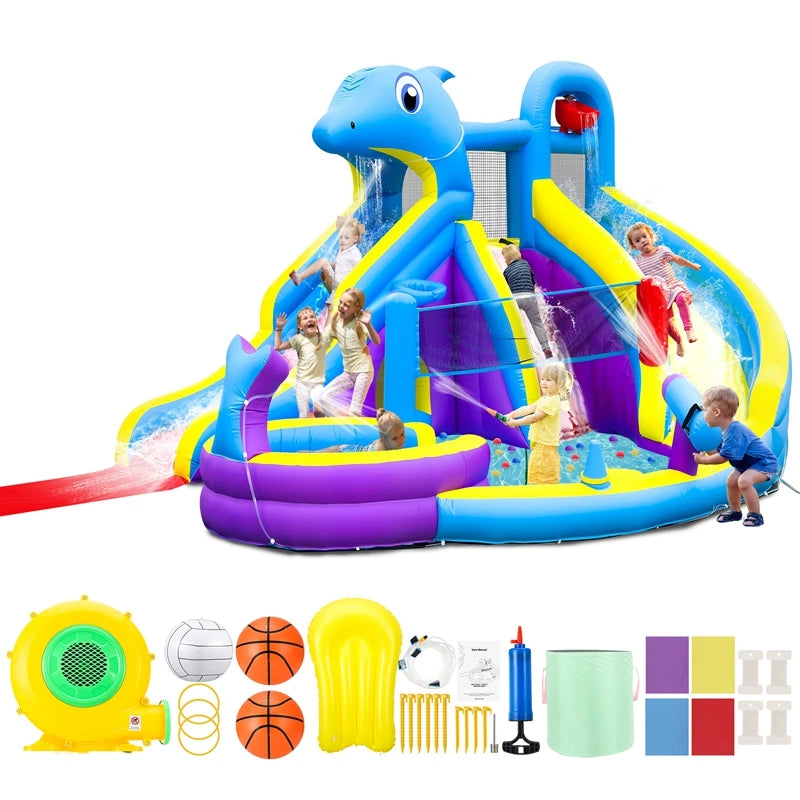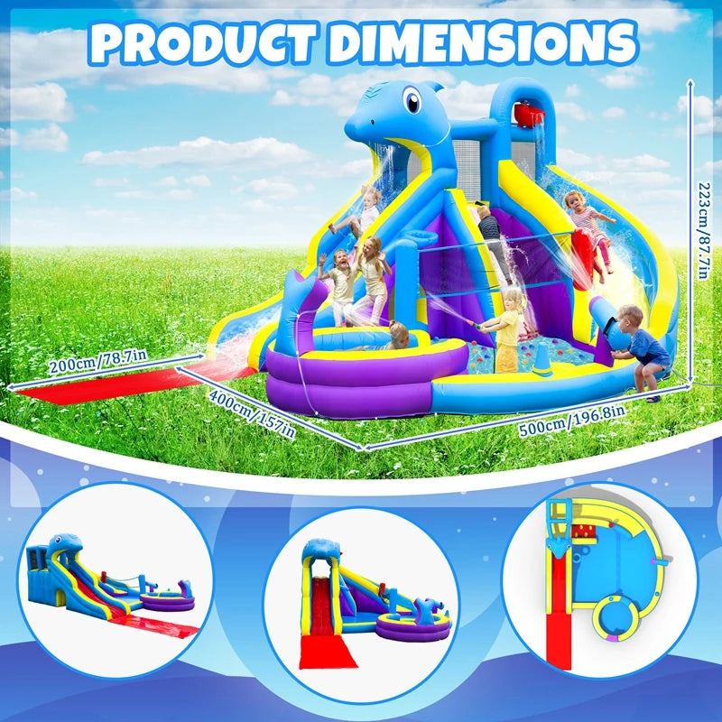 This giant inflatable water slide is packed with fun and excitement, offering 11 different activity zones including dual racing slides, a long slip & splash runway, climbing wall, splash pool, water cannons, tunnel crawl, and more. Designed for hours of action-packed outdoor play, it’s perfect for birthday parties, weekend fun, or beating the heat in epic style.