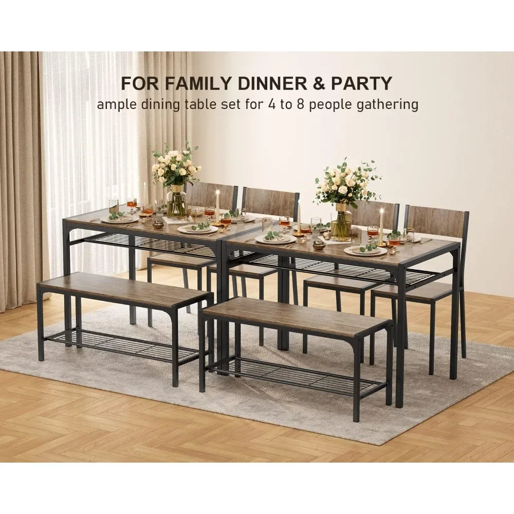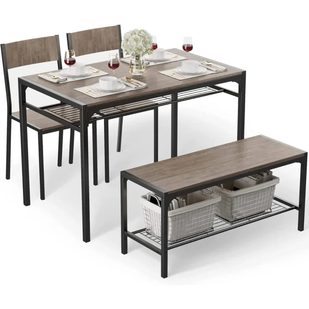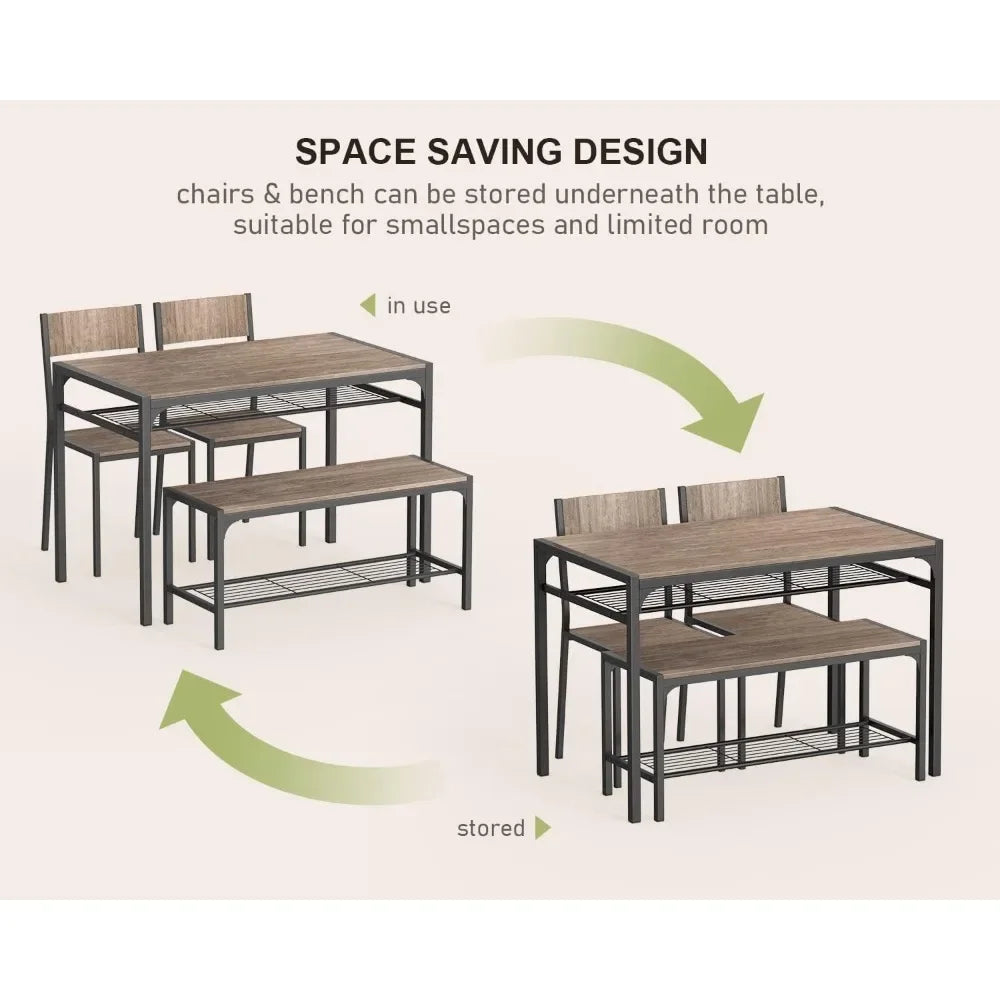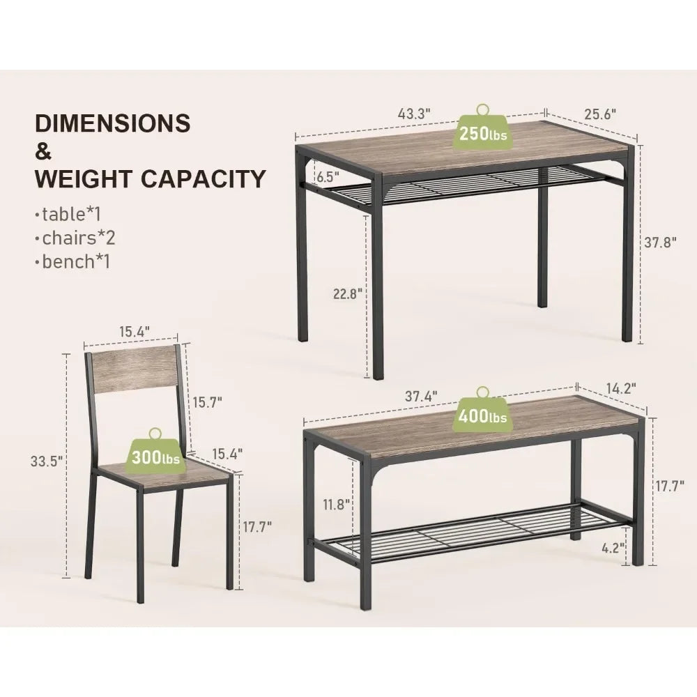 Maximize your dining and living space with this 4-Piece Kitchen Dining Table Set with Bench and Chairs, designed for both style and functionality. Featuring reinforced corners for durability and a built-in storage rack beneath the table and bench, this set keeps your essentials organized while maintaining a clean and modern look. The space-saving design allows the chairs and bench to tuck neatly under the table when not in use, making it an excellent choice for small kitchens, apartments, or compact dining rooms. Built with a sturdy metal frame and smooth, easy-to-clean surfaces, it’s designed for everyday comfort—whether used for family meals, casual entertaining, or even as a workspace.