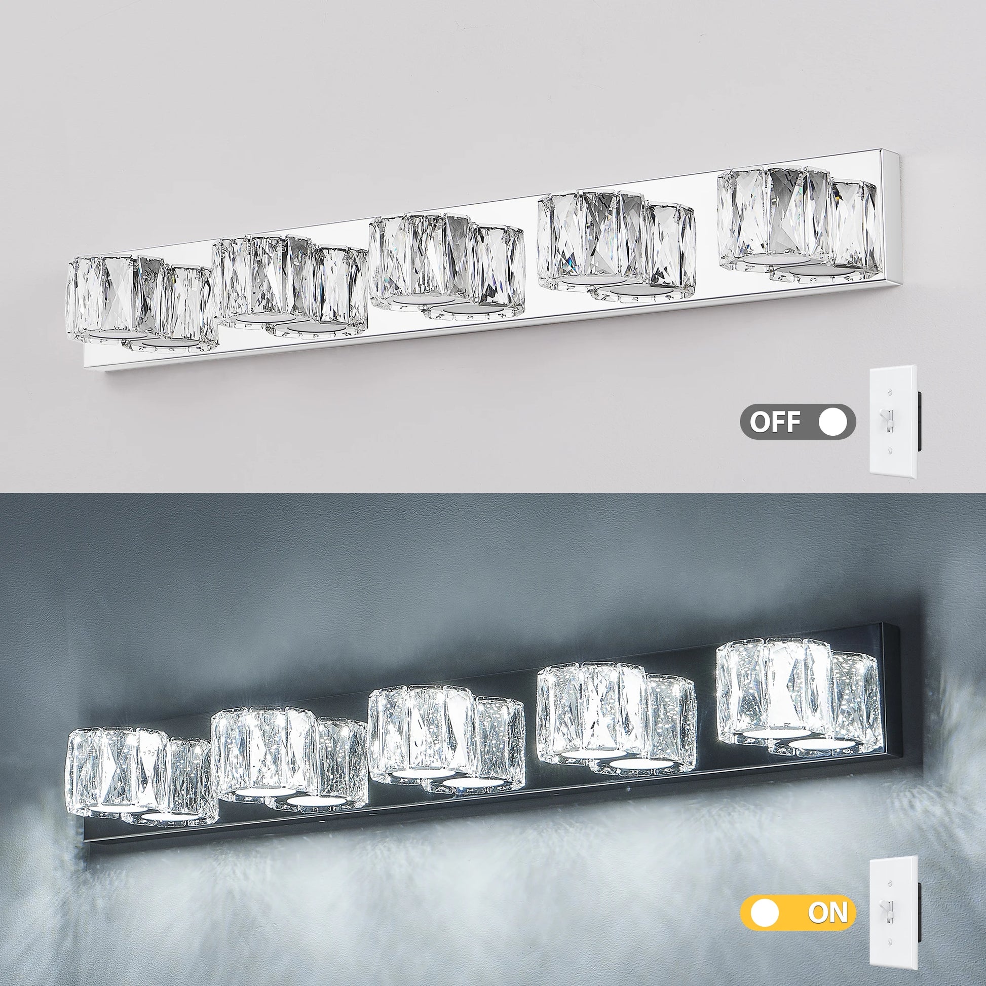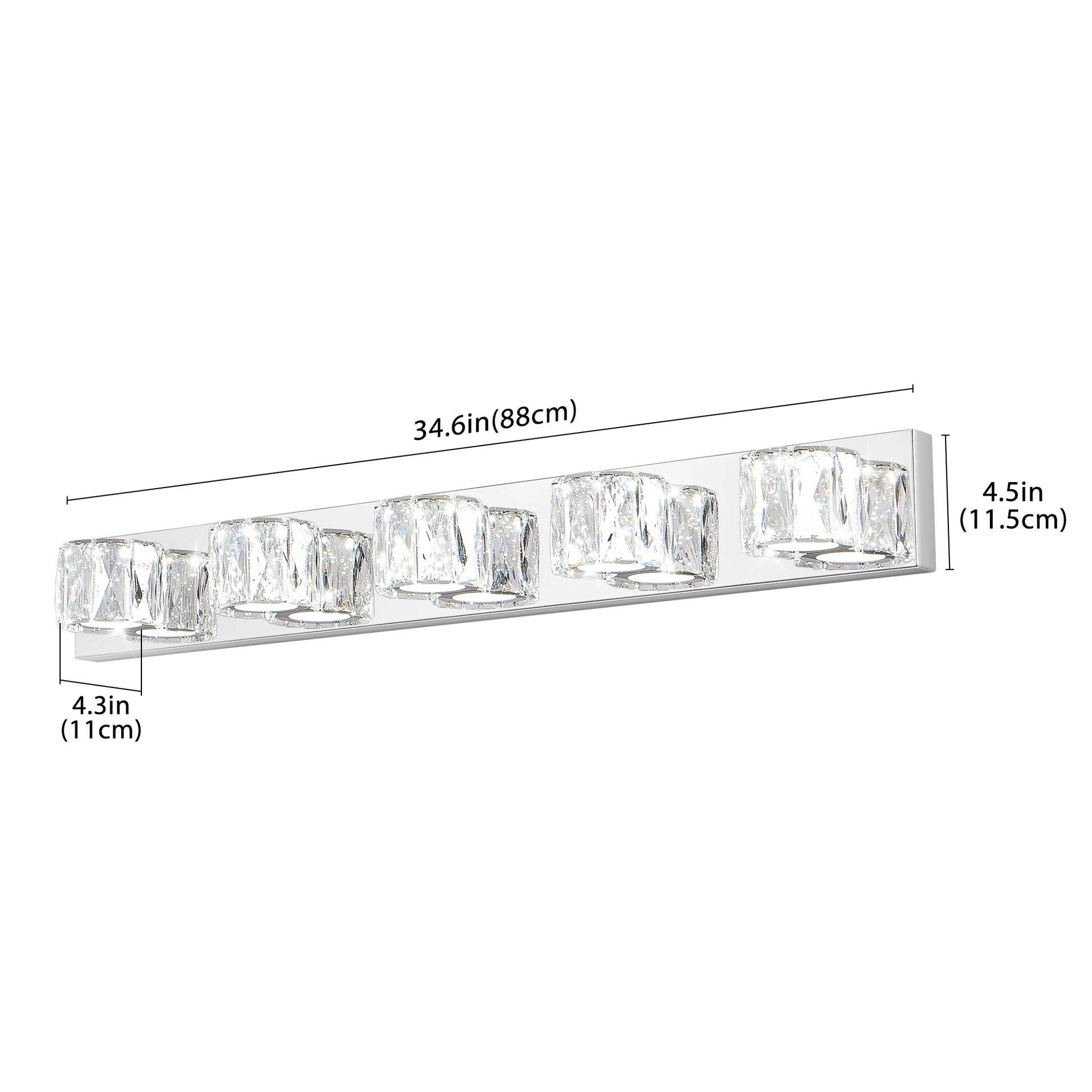 Elevate your interior lighting with this 35-inch Modern Crystal 5-Light LED Wall Sconce, designed to blend glamour and function. Featuring a polished chrome finish and five crystal-clear shades, it delivers brilliant illumination while adding a luxurious touch to your space.