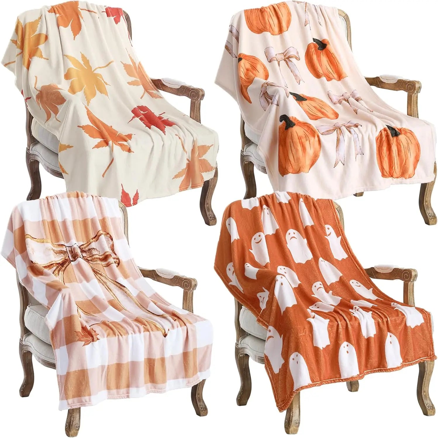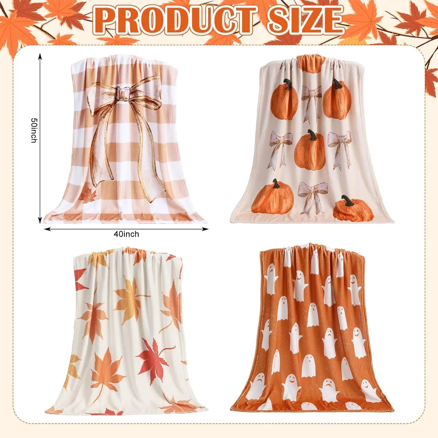 4 Pcs Fall Throw Blankets – Soft Warm Autumn Flannel with Pumpkin, Maple, Plaid & Little Ghost Patterns, Cozy for Thanksgiving & Halloween