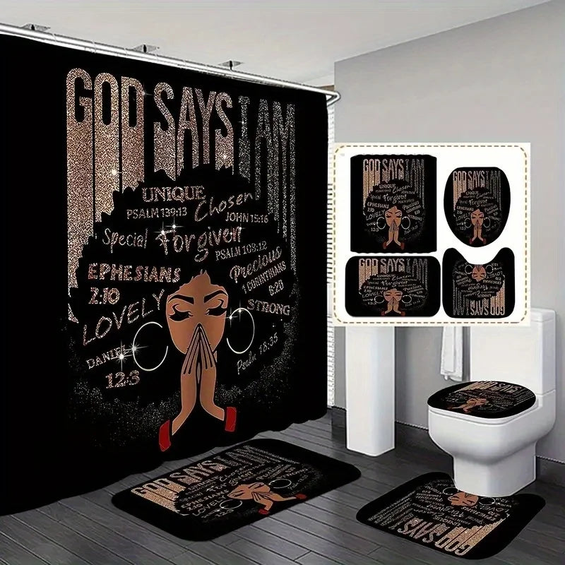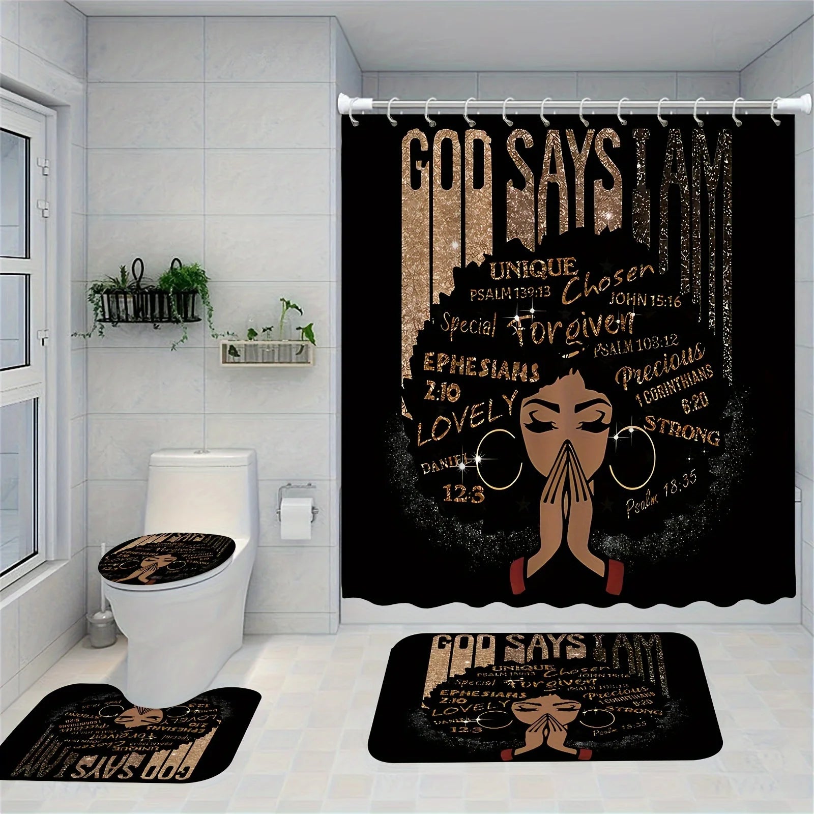 4PCS African-American Woman Shower Curtain Set with 12 Hooks – Non-Slip Bathroom Mat, U-Shaped Toilet Rug & Lid Cover