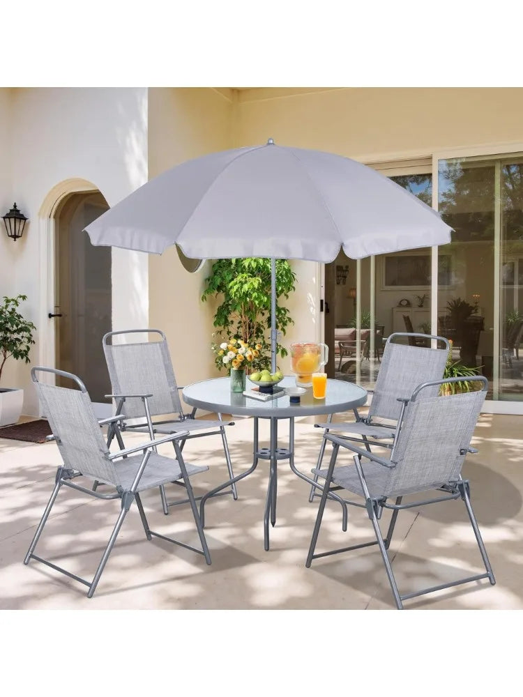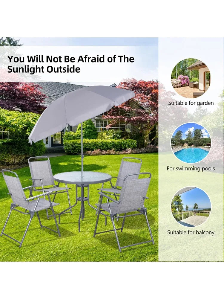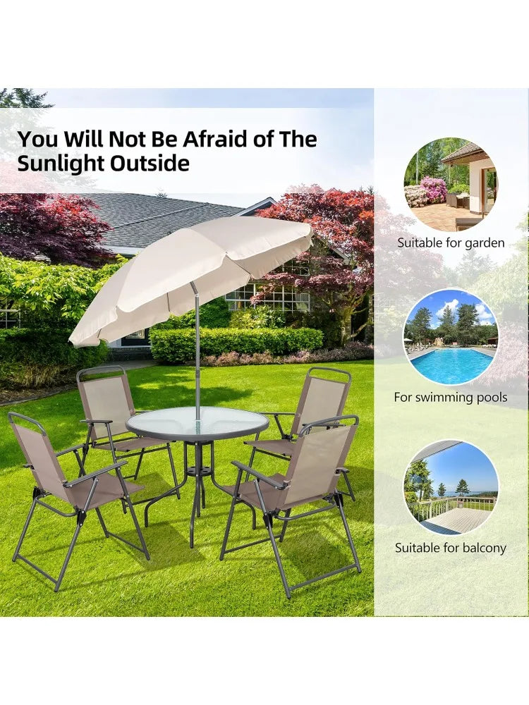 Elevate your outdoor living with this 6-Piece Folding Patio Dining Set, perfect for gardens, patios, balconies, or backyards. Crafted from powder-coated steel, this set is weather- and rust-resistant for long-lasting durability. The 4 folding chairs feature breathable, sweat-absorbing Textilene fabric for comfort and fast drying after use, while the tempered glass table adds elegance and practicality.