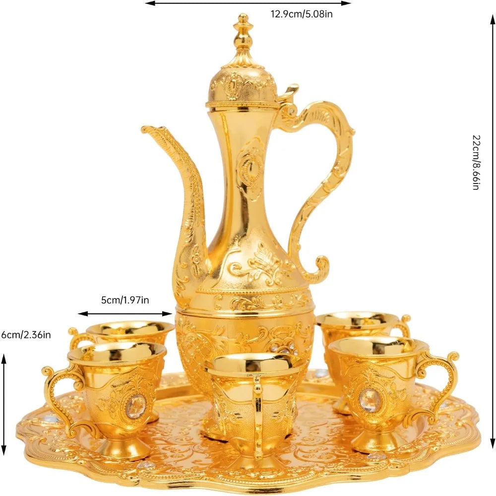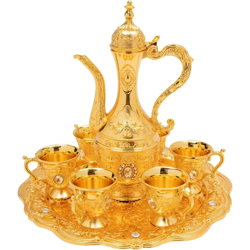 Made from durable metal, this set is both functional and decorative, perfect for serving tea, coffee, wine, or even espresso during gatherings, special occasions, or everyday moments. The ornate design reflects authentic Turkish craftsmanship, making it an ideal gift or centerpiece for cultural appreciation and stylish hosting.