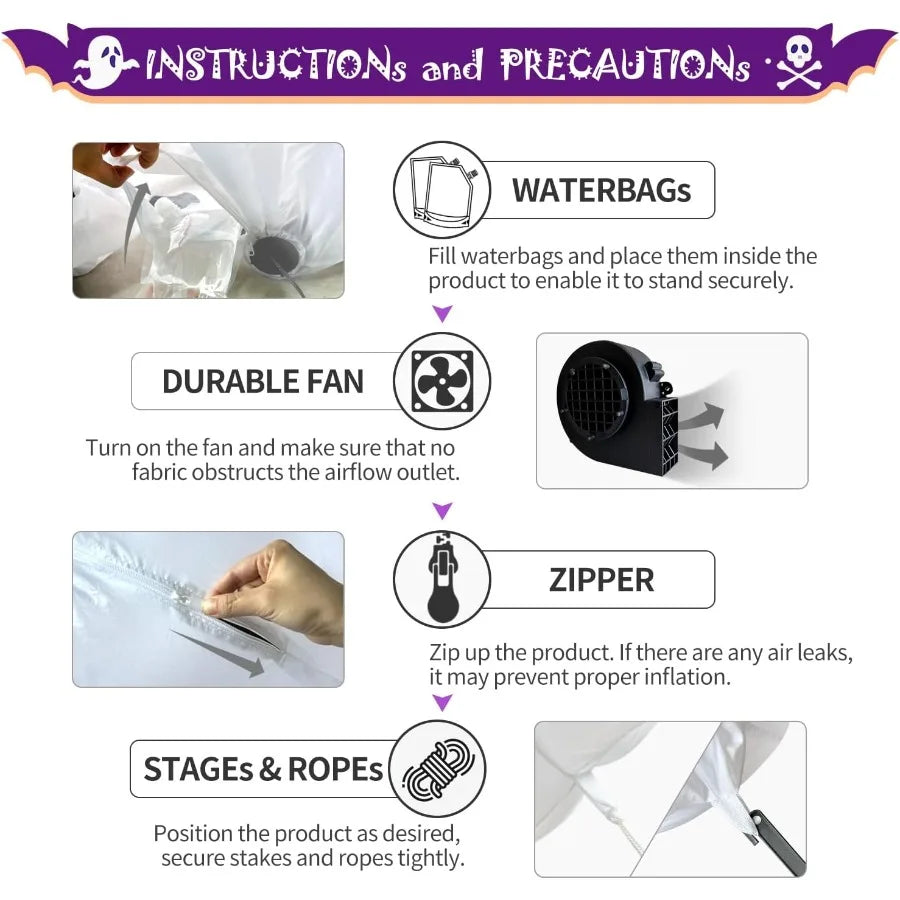 Add epic spooky fun to your Halloween with this 6FT Inflatable Skeleton Knight Riding a Dinosaur! Combining fantasy and fright, this unique blow-up decoration features a skeletal warrior atop a fierce dinosaur, illuminated by bright built-in LED lights for an eye-catching nighttime glow. Perfect for yards, gardens, porches, or party setups, it’s crafted from durable, weather-resistant materials and inflates quickly with the included blower. Stakes and tethers ensure secure placement—make your holiday display unforgettable with this standout inflatable!