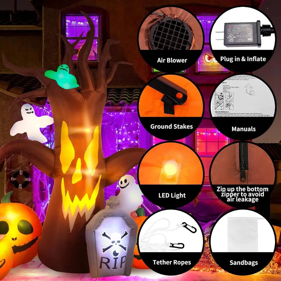 Bring eerie excitement to your Halloween setup with this 8FT Halloween Inflatable Dead Tree Decoration. Featuring creepy elements like spooky faces, bats, pumpkins, and glowing built-in LED lights, this inflatable transforms your garden or lawn into a haunted scene by night. Designed for outdoor durability, it inflates quickly and stays secure with included stakes and tethers. Whether you’re decorating for trick-or-treaters, a party, or a haunted house, this blow-up dead tree adds chilling charm to your holiday décor.