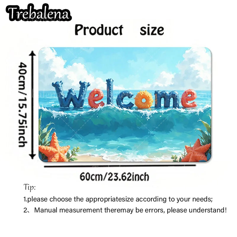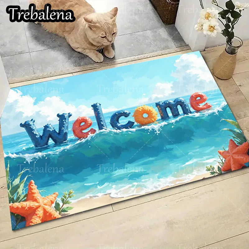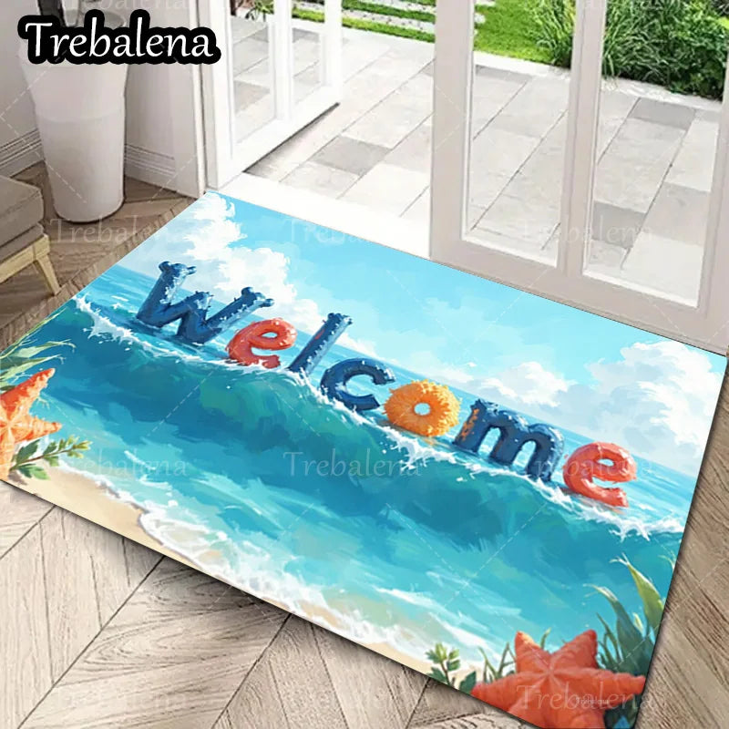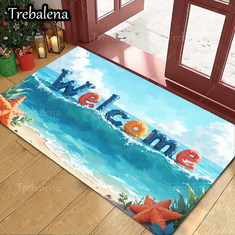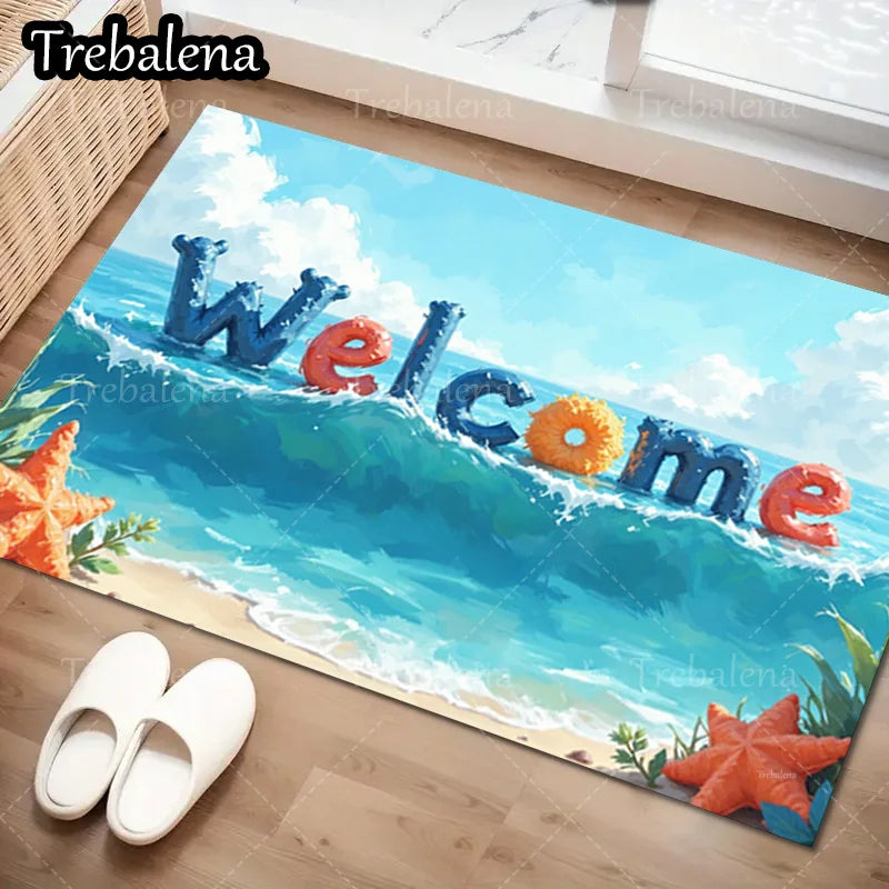 Beach Welcome Door Mat – Ocean Wave & Starfish Decorative Entryway Rug