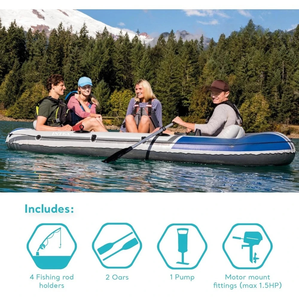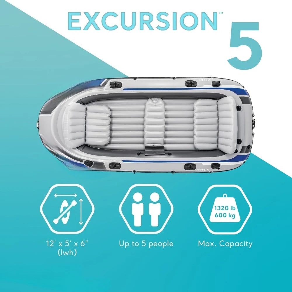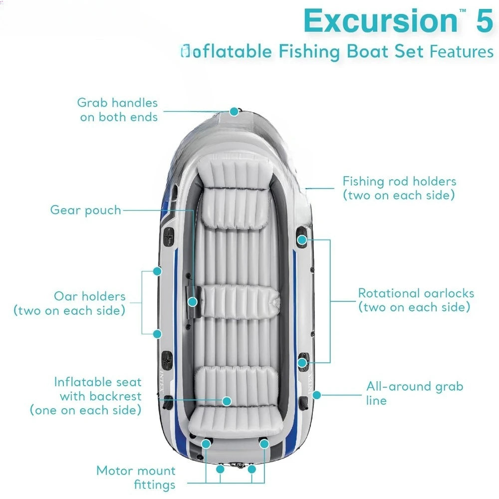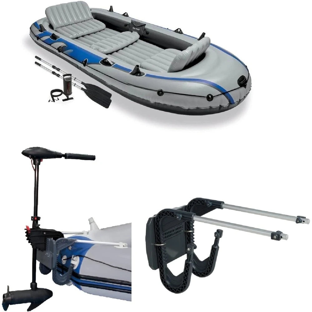 Excursion 5-Person Inflatable Boat Set – Includes 2 Aluminum Oars, High-Output Pump, 12V Transom Trolling Motor Mount Kit for Fishing & Recreation