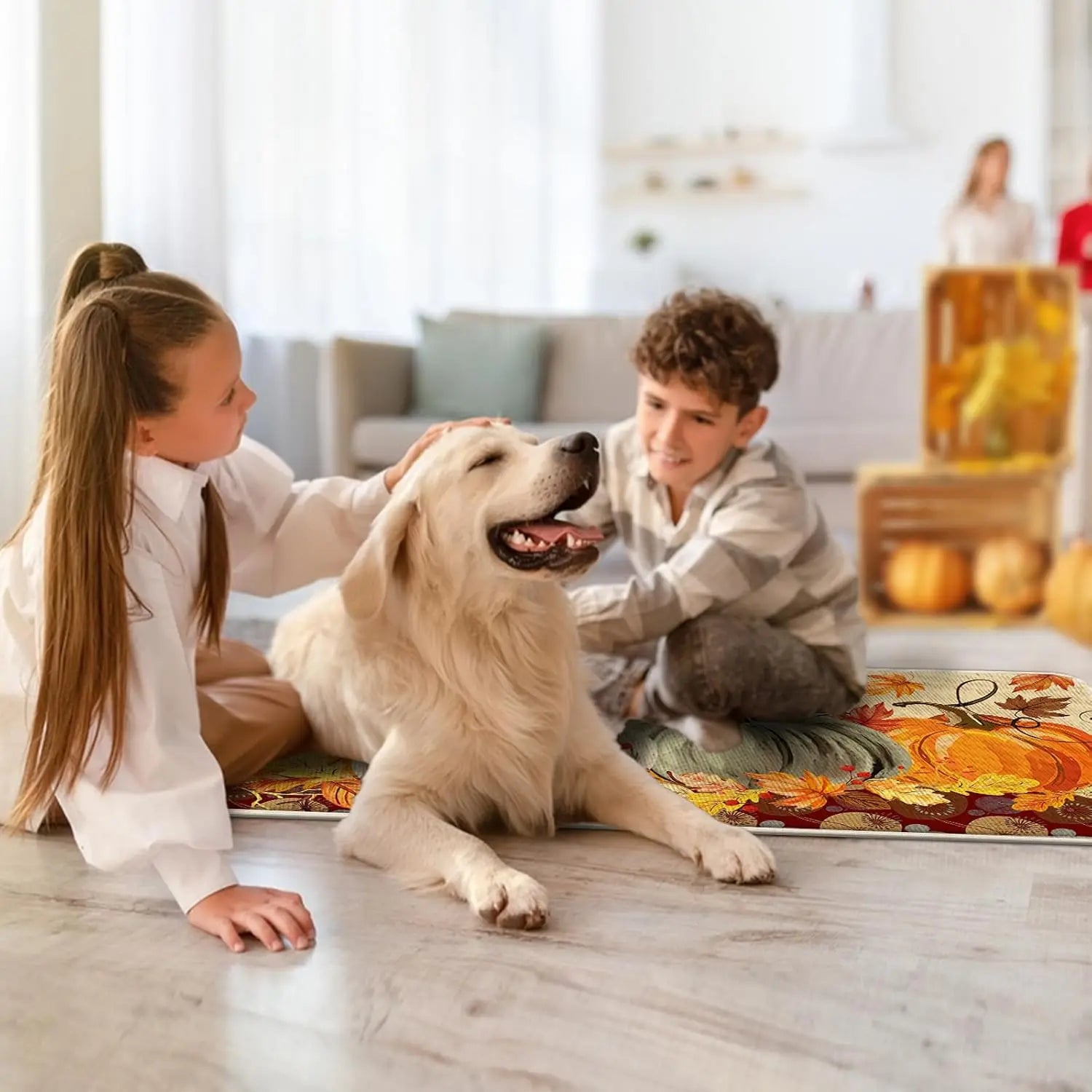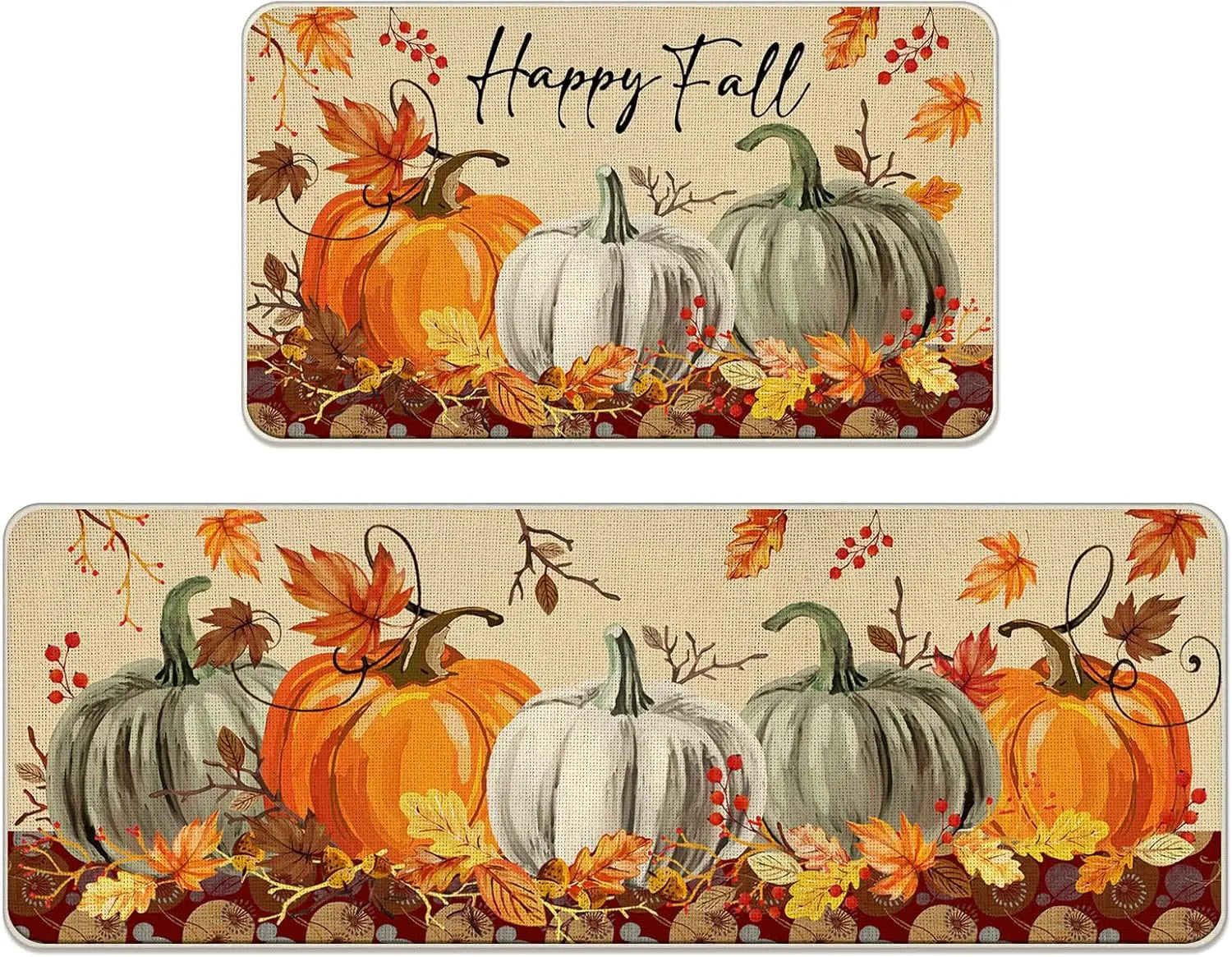 Fall Pumpkin Kitchen Mat – Autumn Maple Leaf Non-Slip Rug for Entryway, Living Room, Hallway, Laundry Room & Balcony