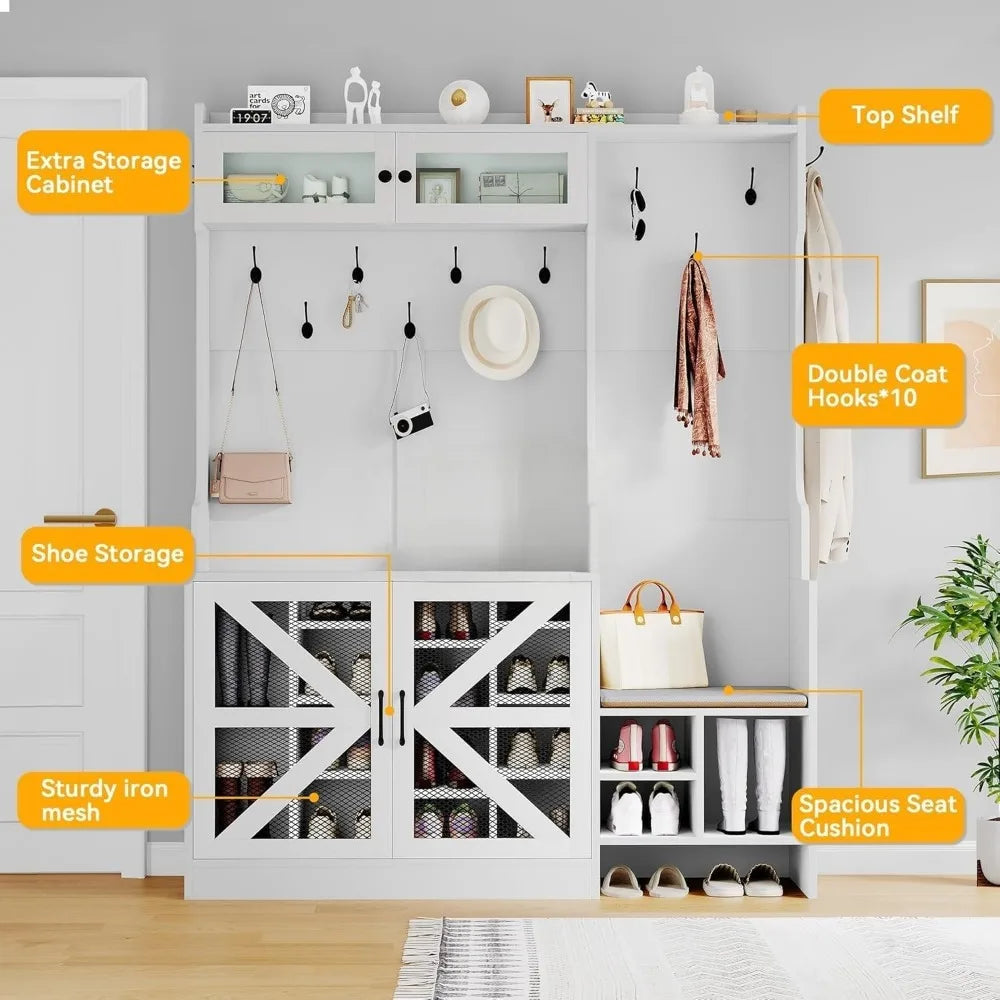 Farmhouse Hall Tree with Bench – Entryway Mudroom Organizer with 18 Shoe Cubbies, 12 Coat Hooks & Storage Bench