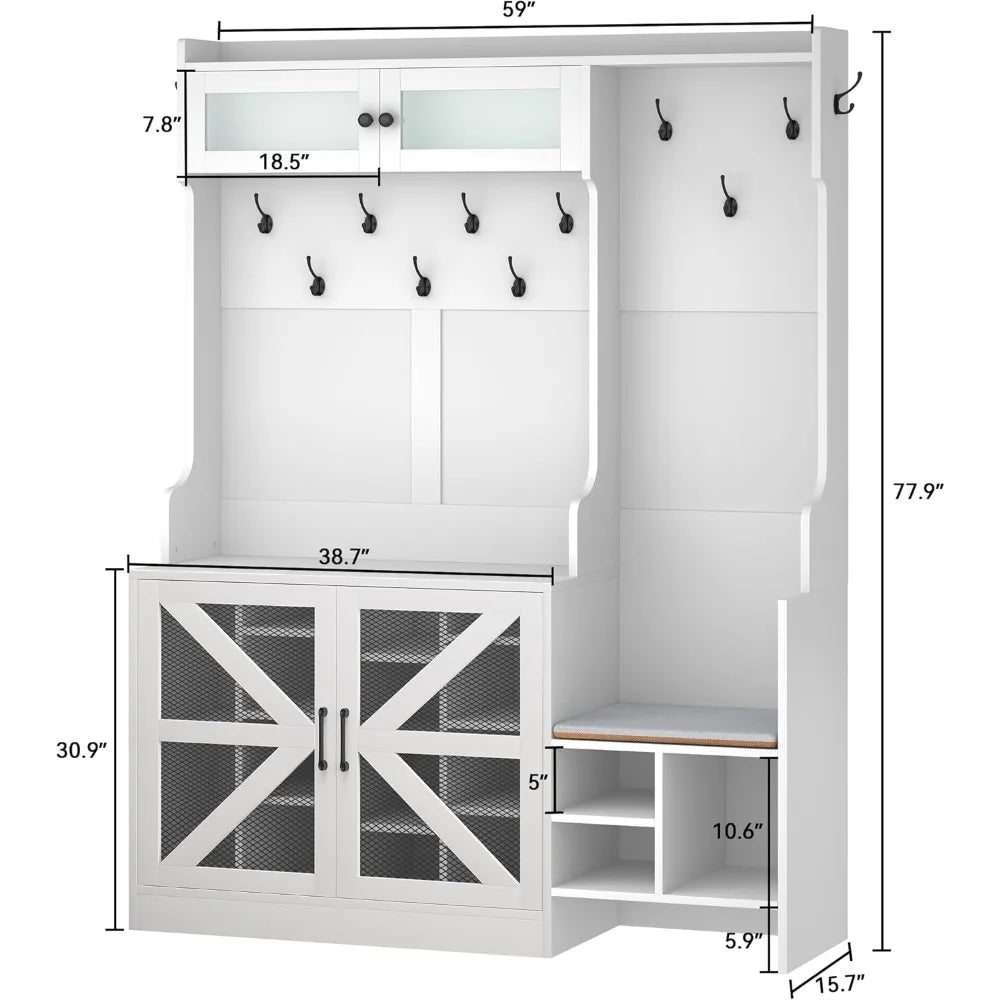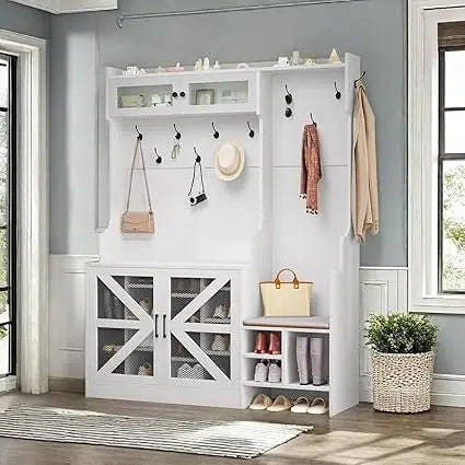 Add rustic charm and practical storage to your entryway with this Farmhouse Hall Tree with Bench. Designed to bring style and organization to your home, this multifunctional piece includes 18 spacious shoe cubbies, 12 durable coat hooks, and a built-in bench for comfort and convenience.