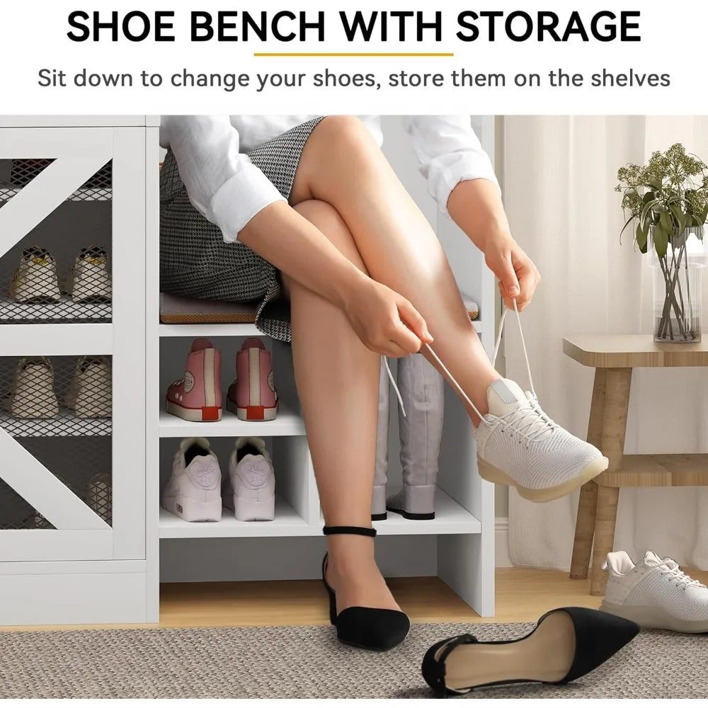 Perfect for mudrooms, hallways, or entry areas, it provides ample space to store shoes, bags, jackets, hats, and more while offering a comfortable seat for removing or putting on shoes. The weathered wood finish and classic farmhouse design make it a beautiful and functional statement piece in any home.