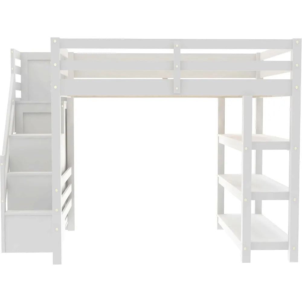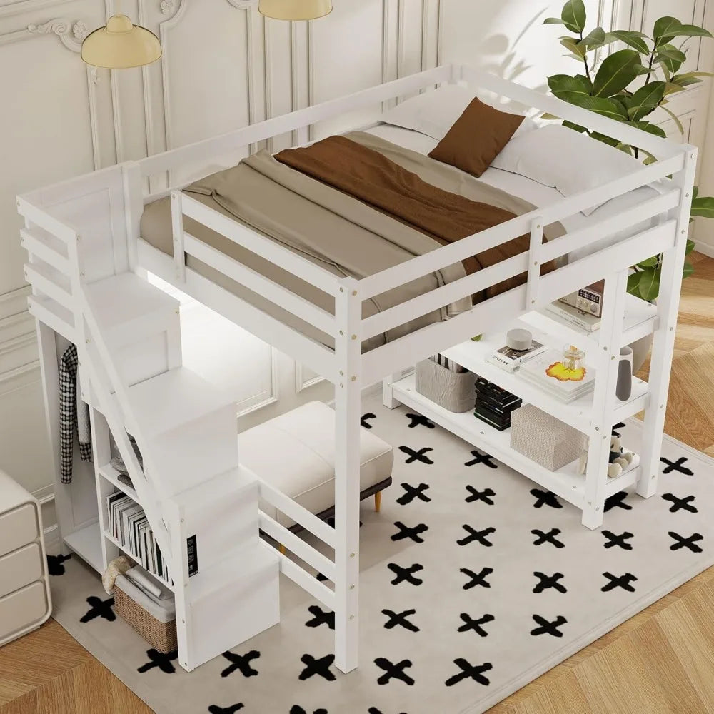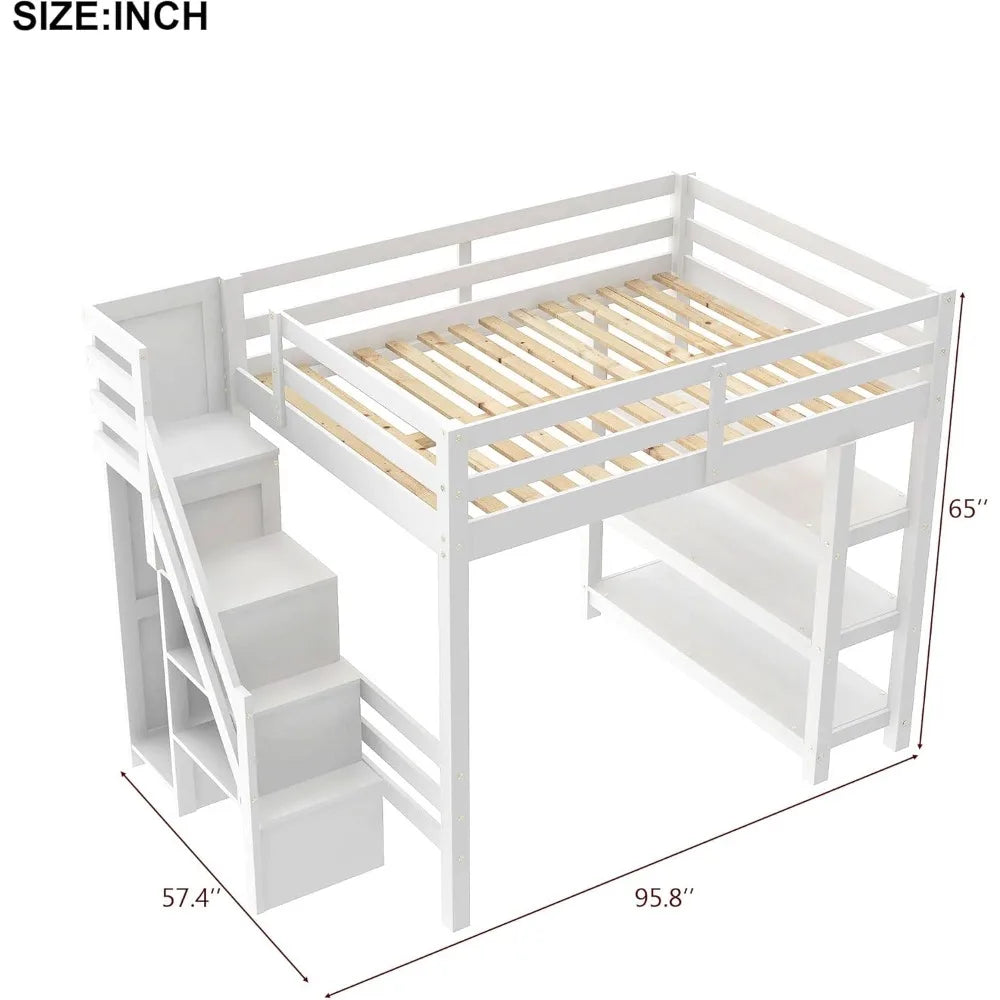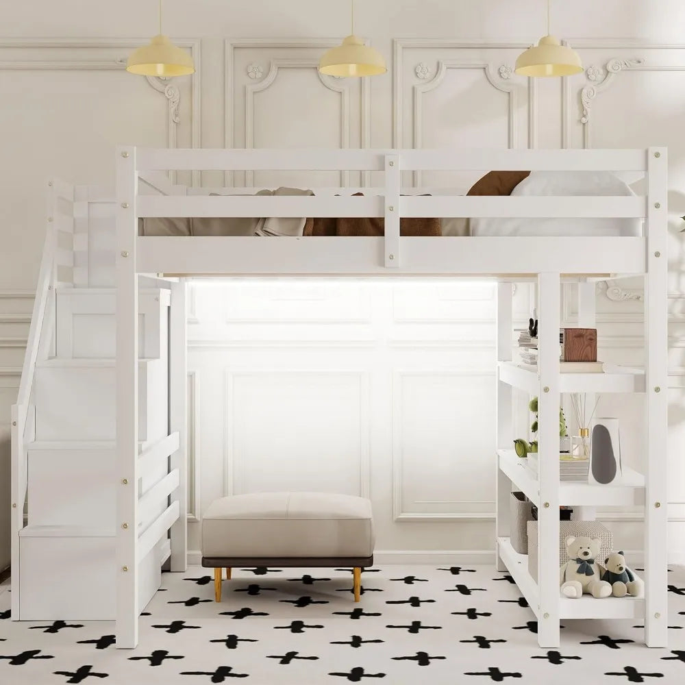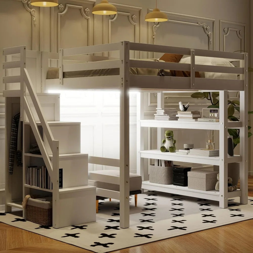 Full Size Loft Bed with Stairs, Storage Shelves & Bookshelf – Wooden Loft Bed Frame with Built-In Lights, Space-Saving Design for Kids, Teens, and Adults