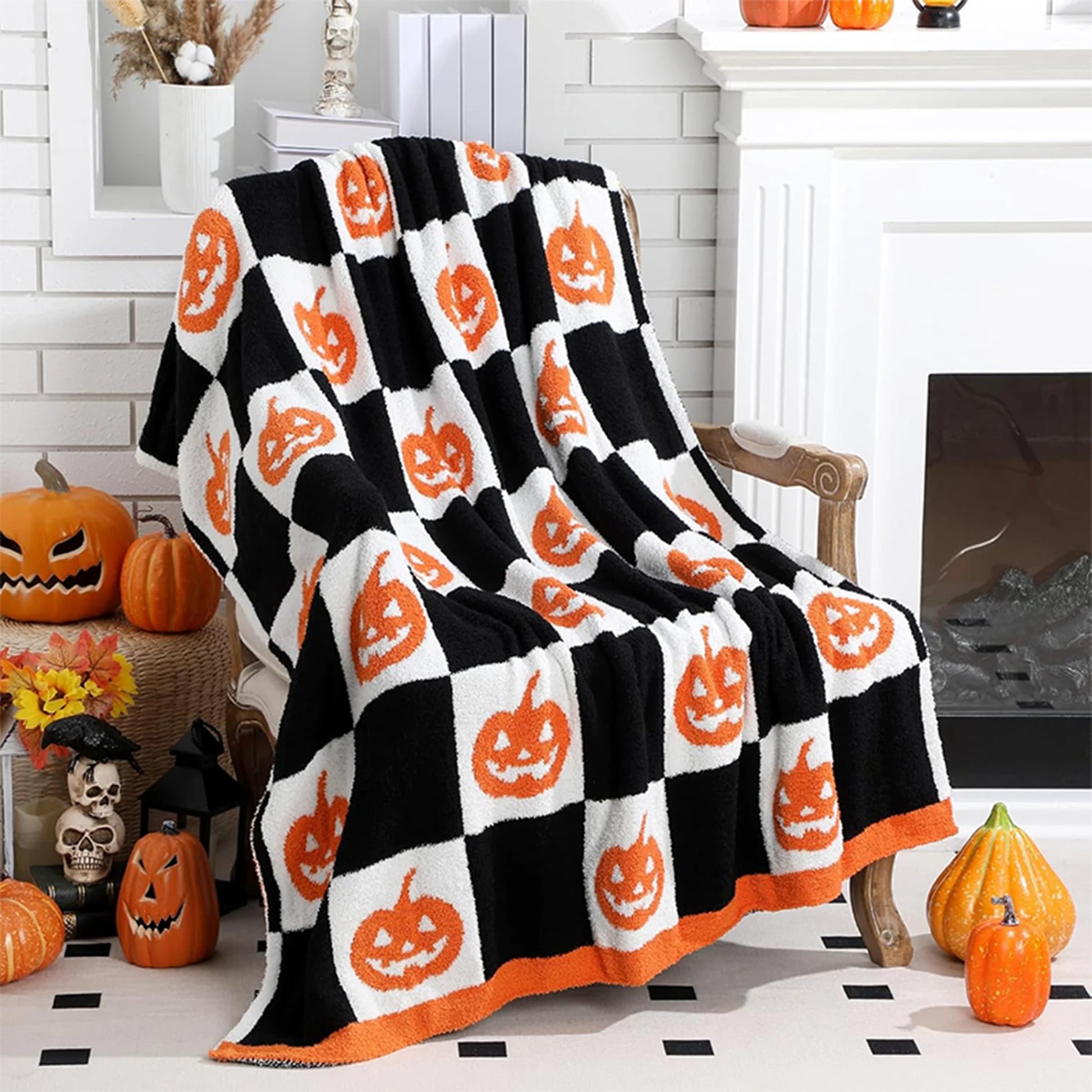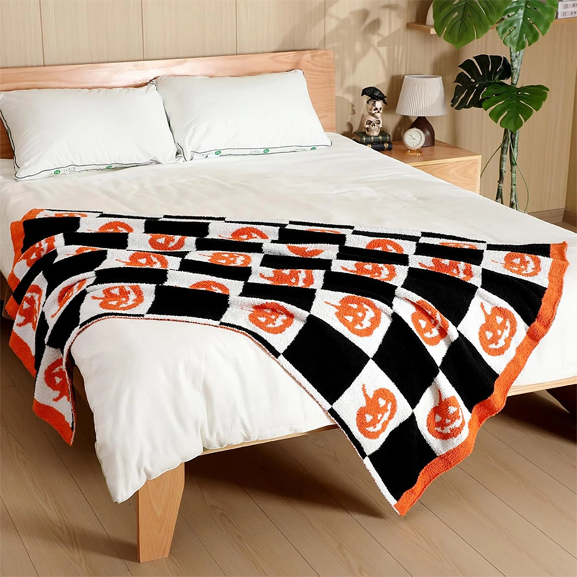 Halloween Checkered Blanket with Pumpkin Patterns – Soft Flannel Cozy Throw for Fall Nights, Home Décor & Gift
