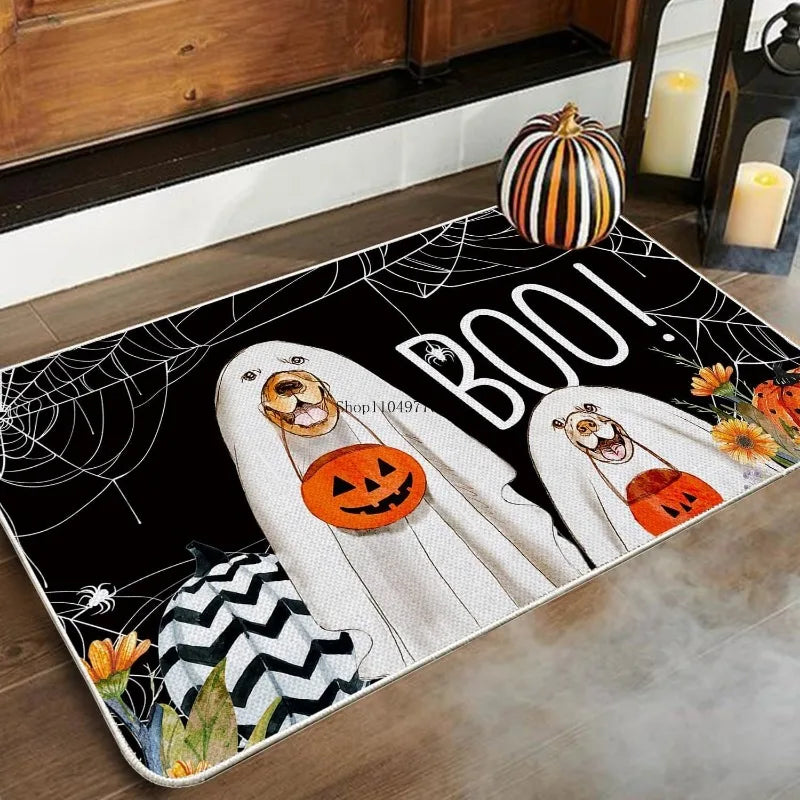 Halloween Dog Doormat – Indoor/Outdoor Fabric Welcome Mat with Ghost, Pumpkin & Spider Web Design – Holiday Front Door Decoration