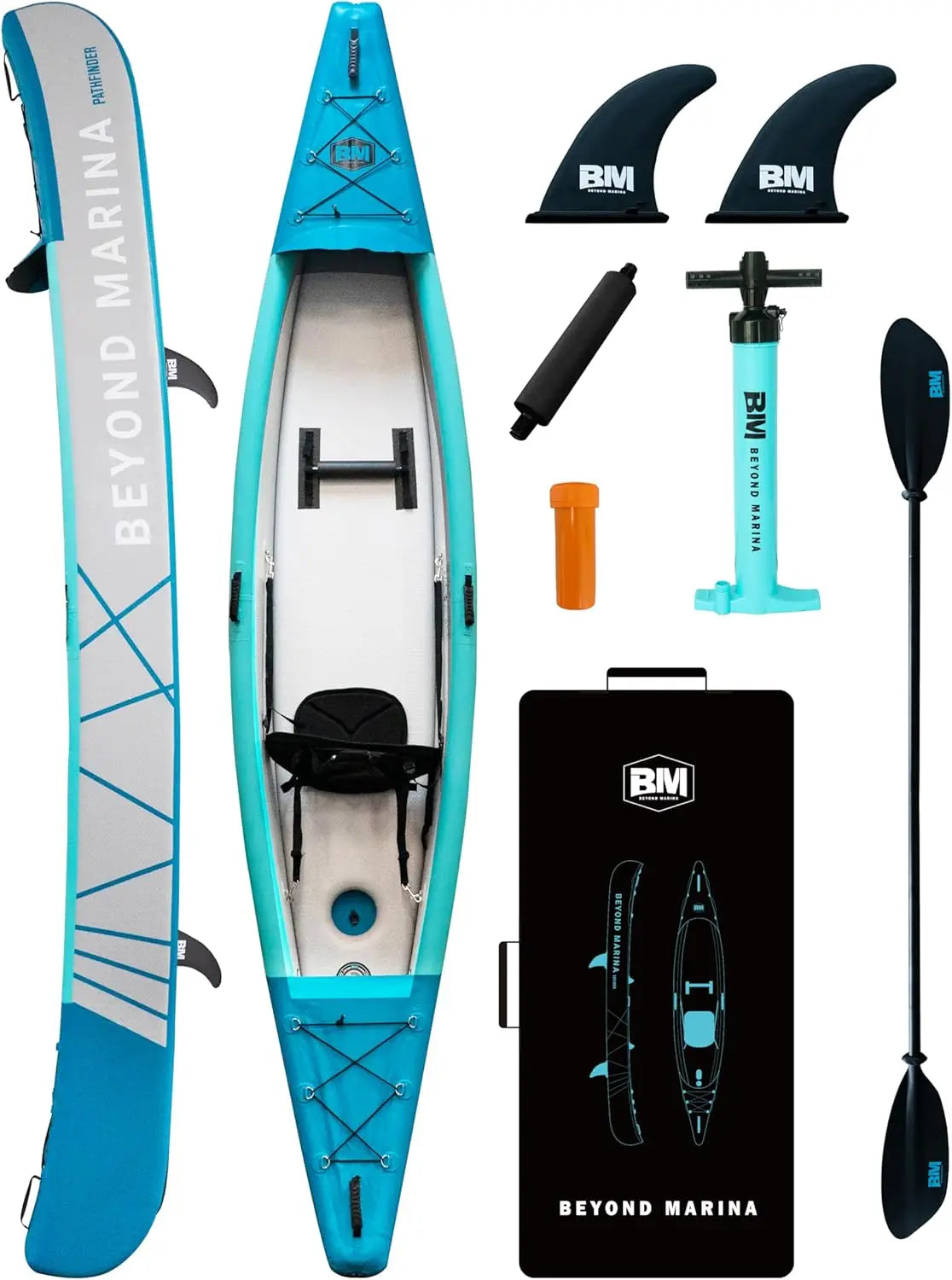 Inflatable Kayak for 1, 2, or 3 Adults – Full Drop-Stitch Touring Kayak with Aluminum Paddles, Adjustable Seats, Footrests, Pump & Fins