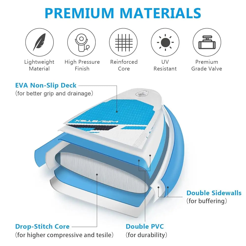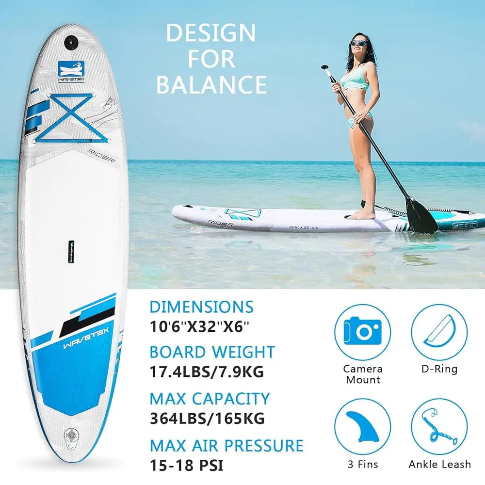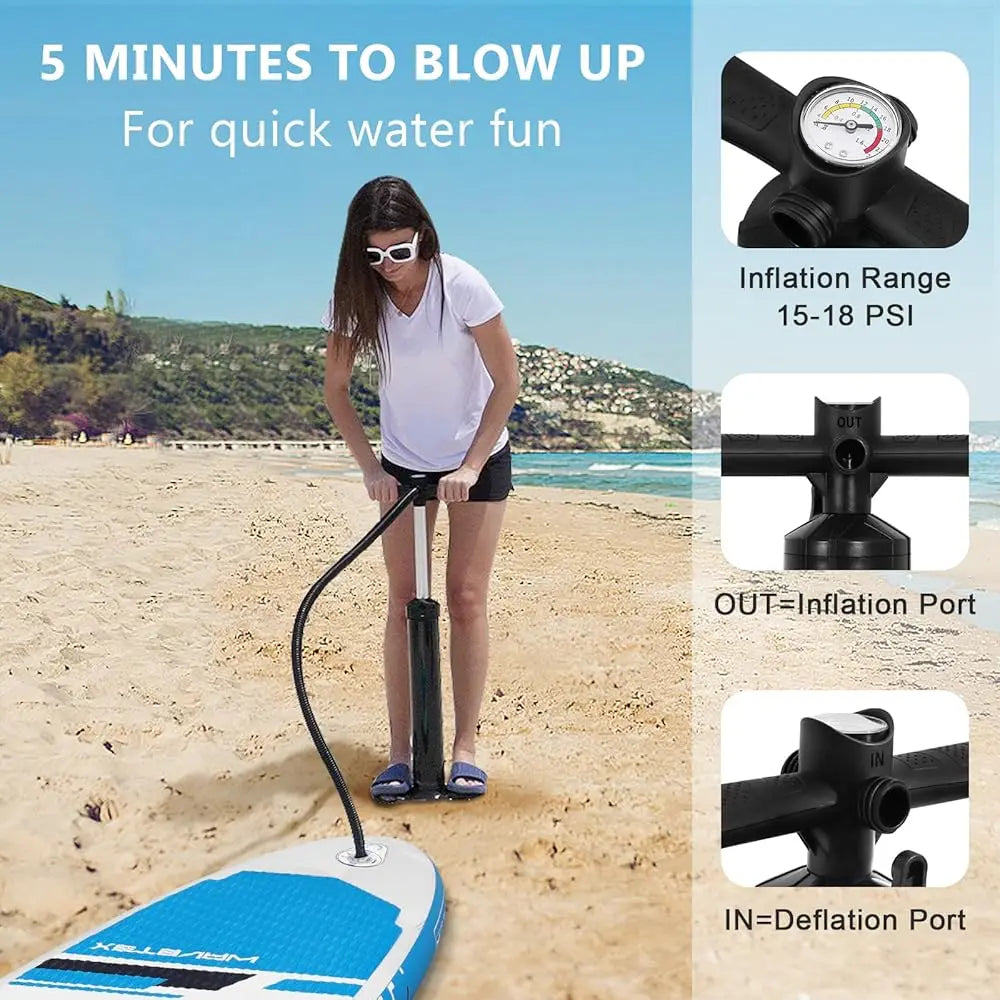 Weighing just 17.4 lbs, this paddleboard inflates in just 5 minutes with the included double-action hand pump with pressure gauge, reaching up to 18 PSI for maximum firmness and stability. The wide, anti-slip deck provides a secure platform for all skill levels.