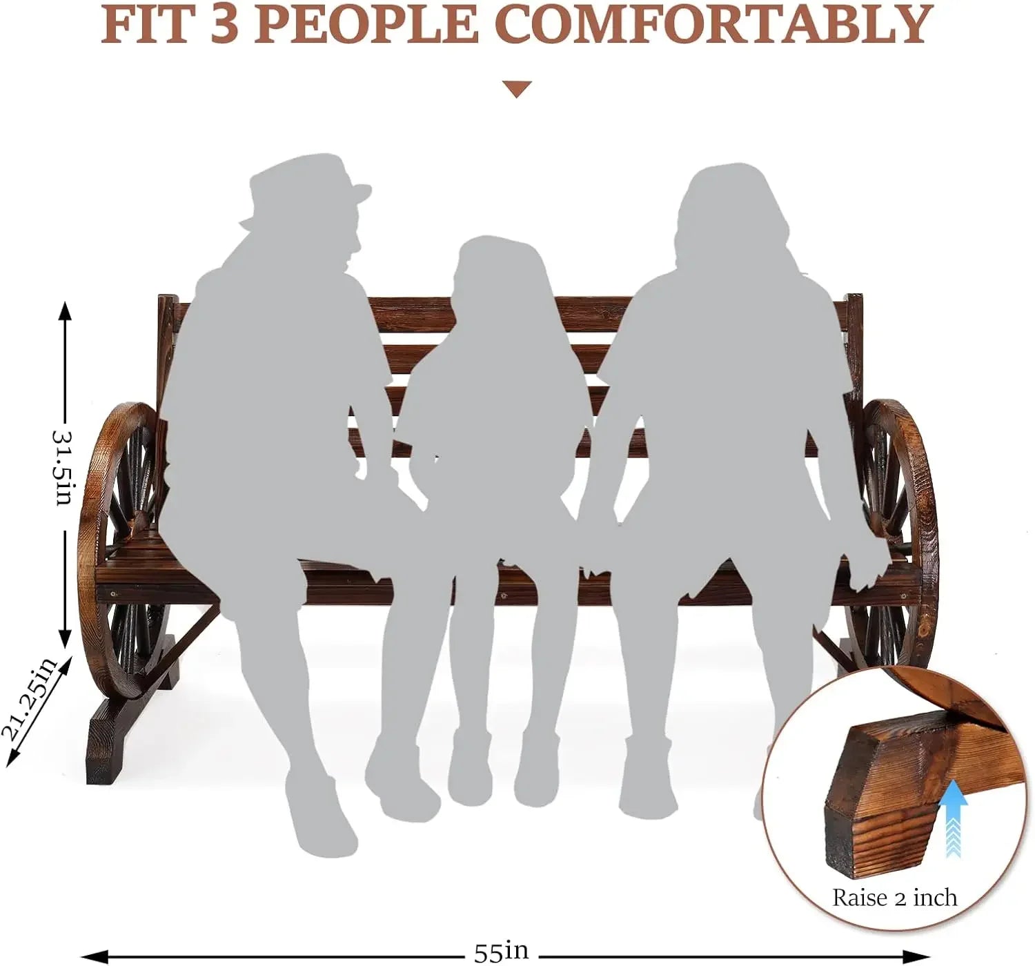 Outdoor Rustic Wooden Bench with Wagon Wheel Arms – 3-Person Garden Bench for Patio, Porch, Lawn & Yard Furniture