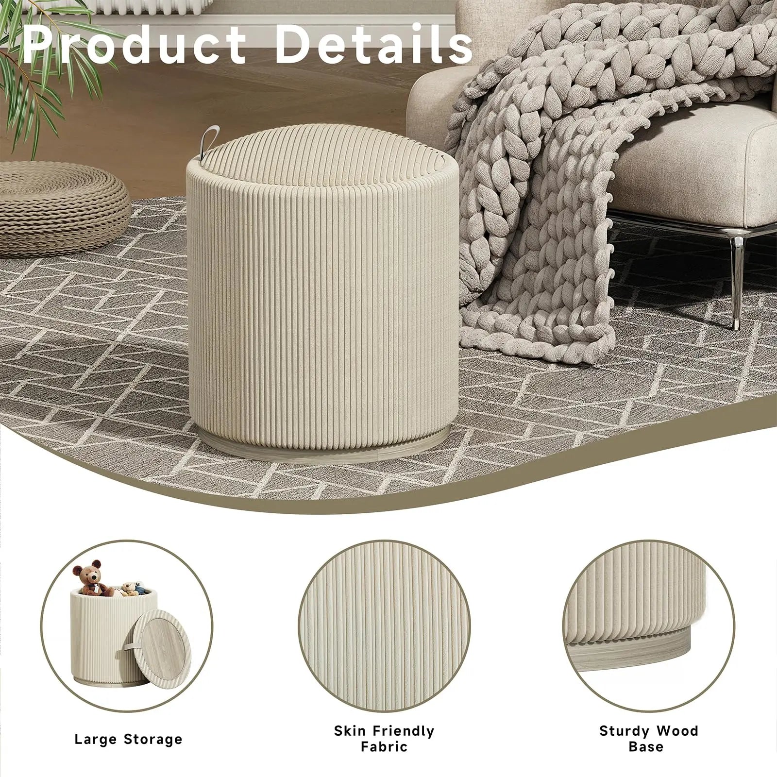 Product Name: Round Storage Stool / Ottoman Organizer Chair – Compact Comfort with Hidden Storage