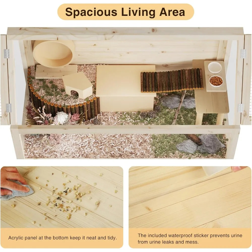 Give your tiny friend a home that’s as charming as it is practical with the Small Wooden Transparent Animal Cage with Storage Shelf — where modern design meets cozy living.