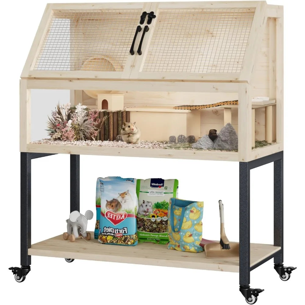The durable wooden frame provides a natural, cozy look that complements any home décor, while the built-in storage shelf keeps food, toys, bedding, and accessories neatly organized and within reach. Thoughtfully ventilated and easy to clean, this cage is both a functional habitat and a tidy solution for pet care.