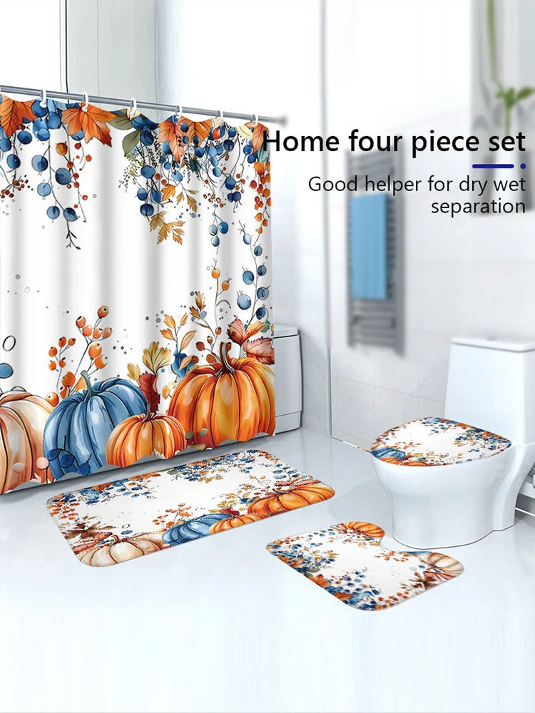 Thanksgiving Shower Curtain Set – 4-Piece Autumn Bathroom Decor with Hooks, Rugs & Mats