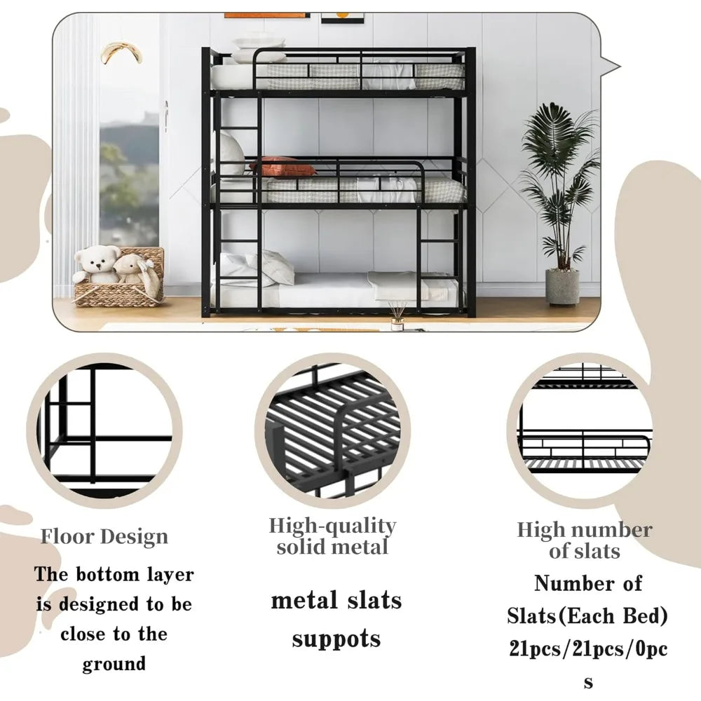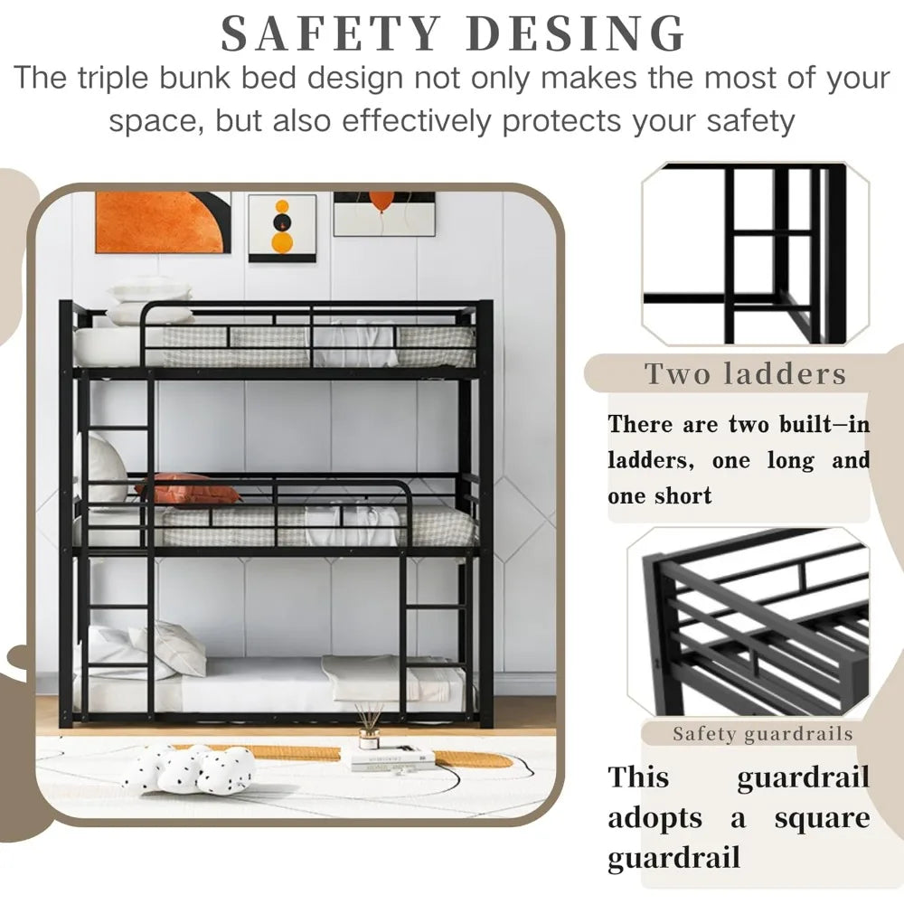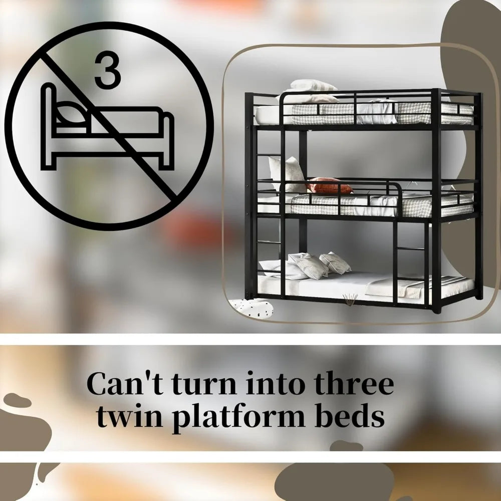 Twin Metal Triple Bunk Bed – Modern Heavy-Duty Space-Saving Bed Frame for 3 Kids, Black Finish