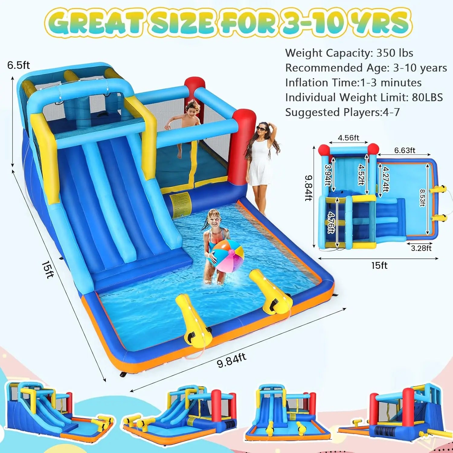 Perfect for outdoor backyard fun in the sun or indoor dry play on colder days, this inflatable water park supports up to 4–7 kids at once (max 350 lbs). The included 480W blower inflates the structure in just 1 minute, while a compact storage bag makes clean-up quick and convenient.