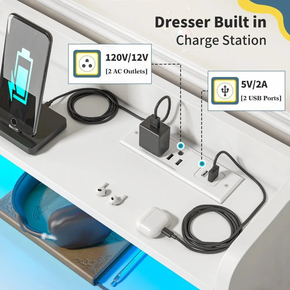 Integrated ambient LED lighting adds a soft, contemporary glow to the dresser’s sleek design, making it not only functional but also a statement piece. Whether used as a primary bedroom storage unit or a stylish accent in a guest room, it blends form and function effortlessly.